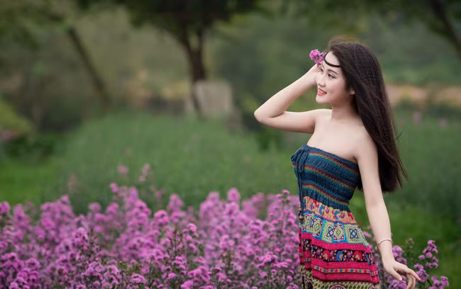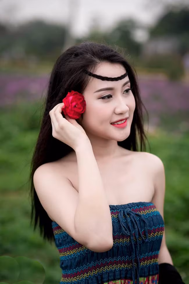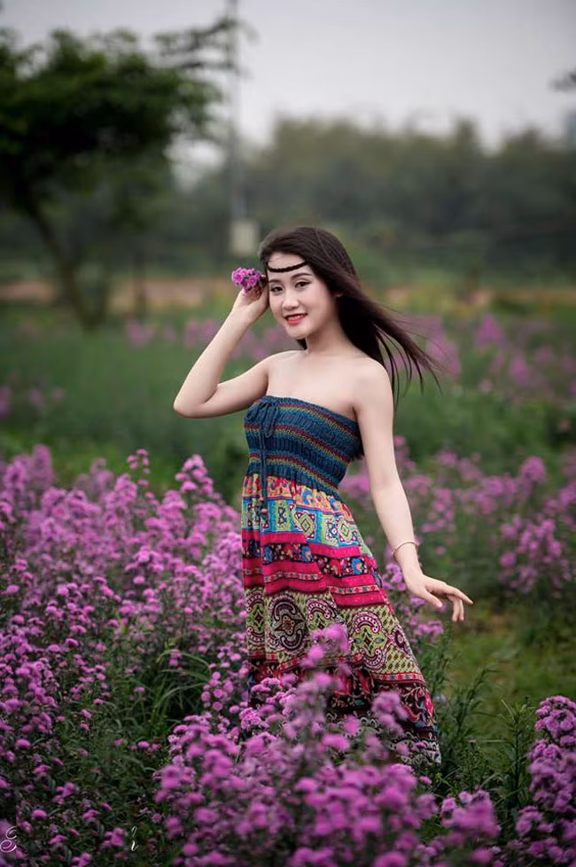 Đồng hoa tím tôn lên làn da trắng nõn của cô gái Hà thành.
