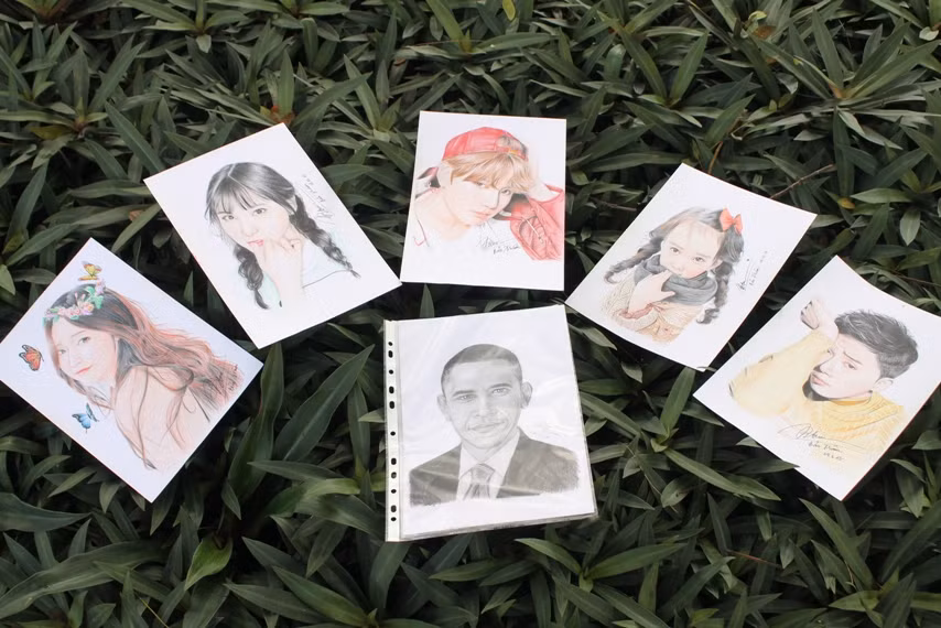 Dù chưa qua trường lớp đào tạo mỹ thuật nhưng Bảo Trâm đã tự tay vẽ nhiều bức chân dung được bạn bè, thầy cô và cộng đồng khen ngợi.