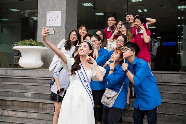 Cuối buổi giao lưu, nàng hậu nhí nhố chụp hình cùng bạn bè, vừa là cô Tân hoa hậu, là niềm tự hào của nhà trường vừa là cô sinh viên Ngoại thương tươi vui, năng động, gần gũi và được bạn bè quý mến.