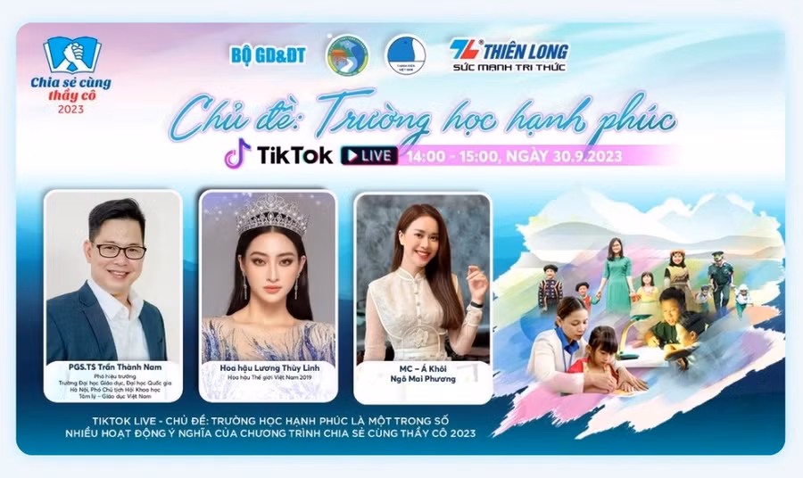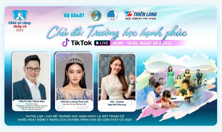 "Chia sẻ cùng thầy cô" năm nay còn tổ chức 2 buổi TikTok Live với sự tham gia của các chuyên gia giáo dục, đại sứ bàn về "hành trình dạy - học hạnh phúc". Buổi giao lưu trực tuyến đầu tiên có sự góp mặt của 3 khách mời gồm PGS.TS. Trần Thành Nam - Phó hiệu trưởng trường ĐH Giáo dục, ĐH Quốc gia Hà Nội, Phó chủ tịch Hội Khoa học tâm lý và Giáo dục Việt Nam, Hoa hậu Lương Thùy Linh và MC - Á khôi Ngô Mai Phương. Các buổi TikTok Live chia sẻ những quan điểm của các khách mời xoay quanh chủ đề “dạy và học hạnh phúc”, truyền đi những thông điệp tích cực với các bạn trẻ.