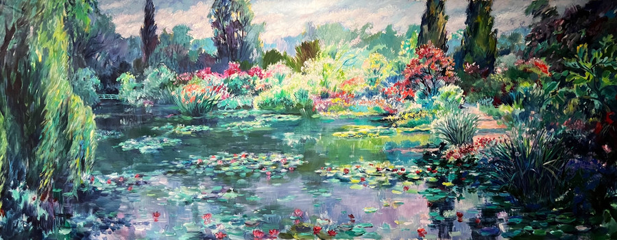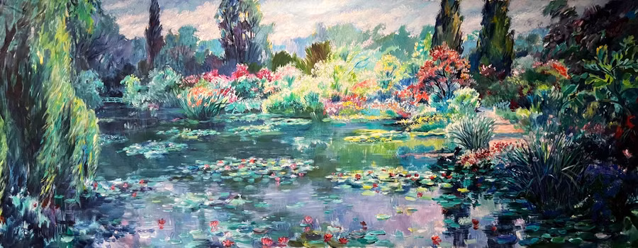 Tại hải ngoại, trong các chuyến đi triển lãm hoặc khi định cư sau này, ông tiếp tục đề cao vẽ đẹp thiên nhiên, với những tác phẩm có tầm cỡ lớn loại mural, như bức vẽ cảnh ao súng, bờ liễu tại Giverny, quê hương của danh họa Claude Monet tại Pháp.