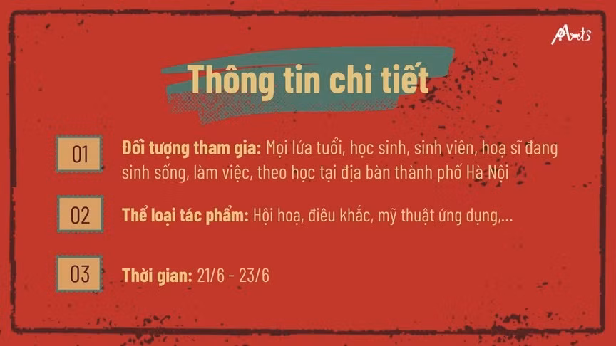 Hơn 100 tác phẩm hội họa, nghệ thuật của các họa sĩ trên khắp địa bàn thành phố Hà Nội được giới thiệu trong triển lãm với mong muốn tạo ra những ảnh hưởng tích cực đến xã hội thông qua từng tác phẩm nghệ thuật. Sự kiện chính là cơ hội thúc đẩy đam mê sáng tạo, khát khao sáng tác của các bạn trẻ và cơ hội để kết nối với các nghệ sĩ chuyên nghiệp.