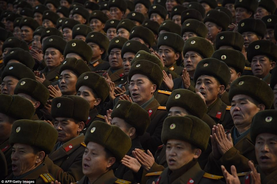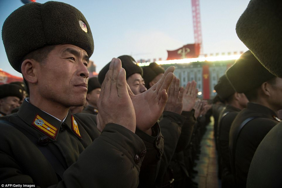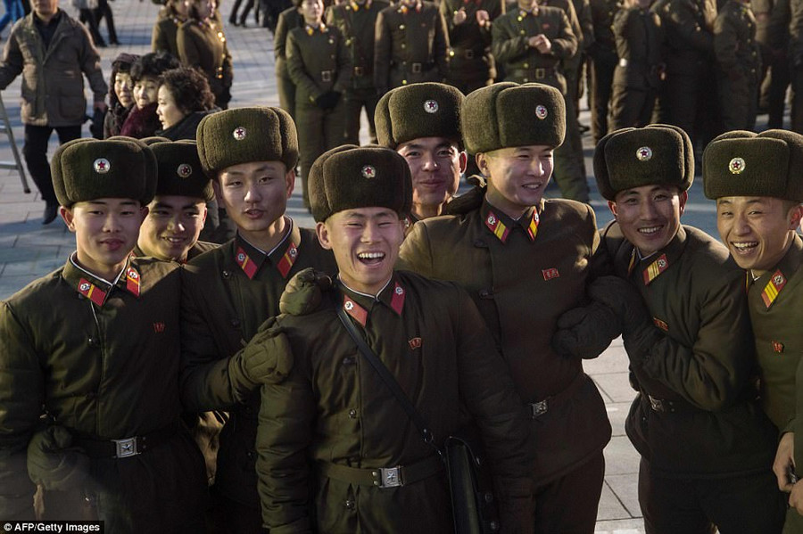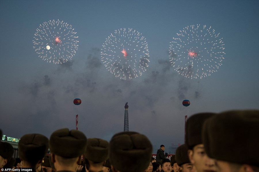 Binh lính ăn mừng, cười nói dưới những chùm pháo hoa rực rỡ thắp sáng quảng trường Kim Il-Sung ở Bình Nhưỡng sau vụ thử thành công tên lửa đạn đạo liên lục địa Hwasong-15 ngày 28/11.