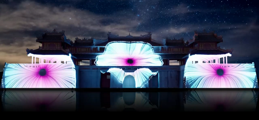 Đây cũng là thành quả của hơn một năm sáng tạo từ ê-kíp AC3 Studio để thực hiện màn trình chiếu ánh sáng trên bề mặt kiến trúc của cổng Ngọ Môn - Đại nội Huế.
