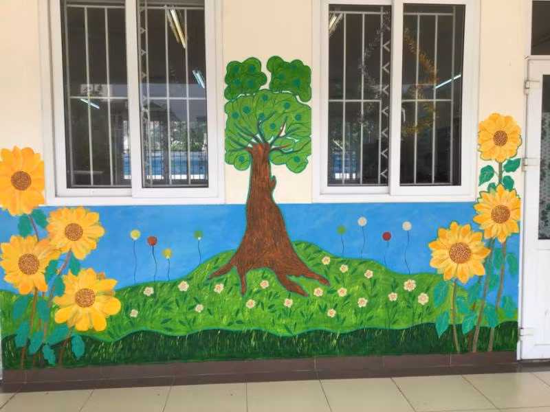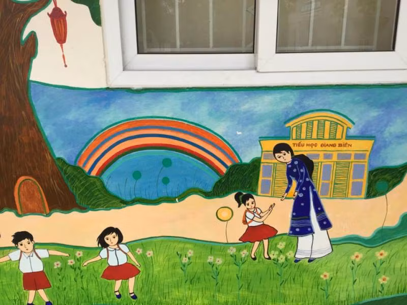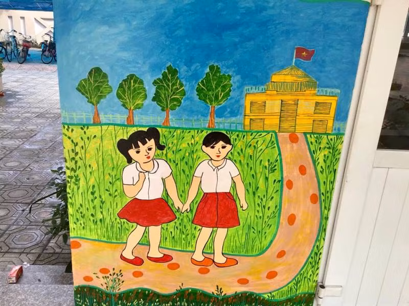 Được biết, để có được những bức bích họa rực rỡ truyền tải những thông điệp yêu thương đến học sinh thân yêu, các cô giáo đã tranh thủ thời gian, "trổ" hết tài họa sĩ, miệt mài sáng tạo vẽ nên những bức tranh tường rực rỡ để ngày khai giảng thêm sinh động.
