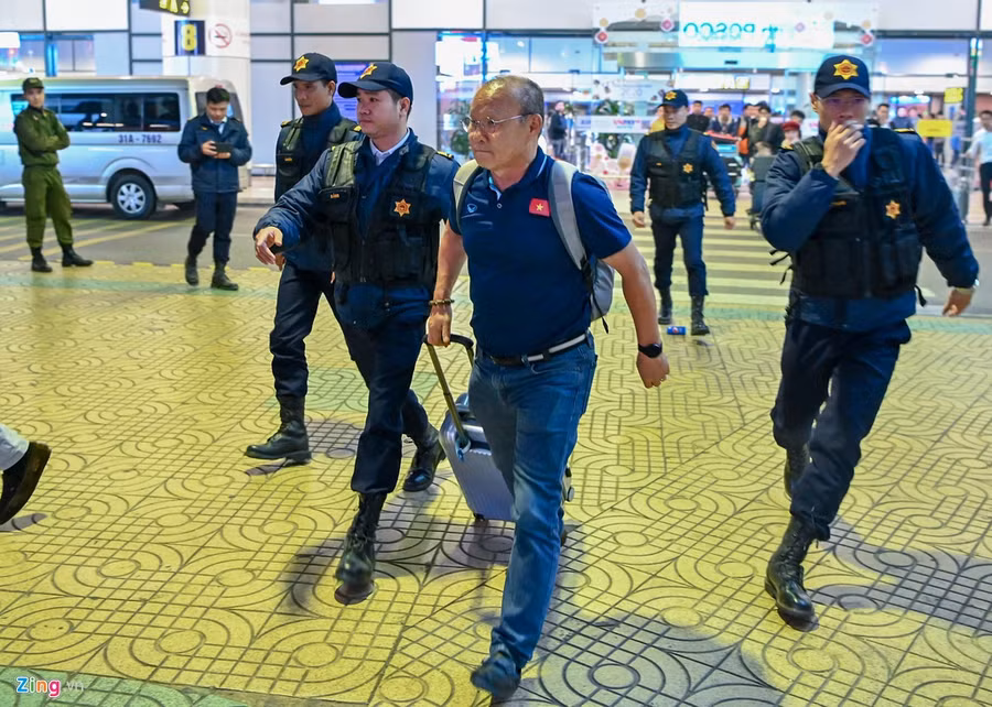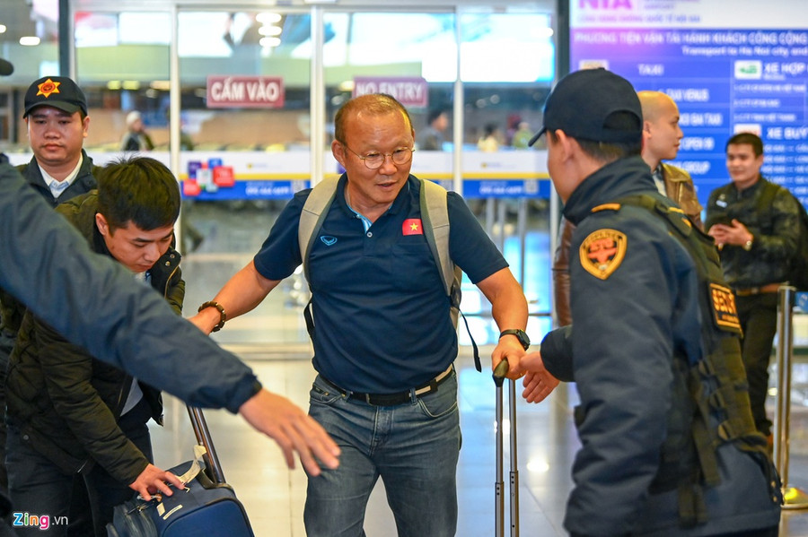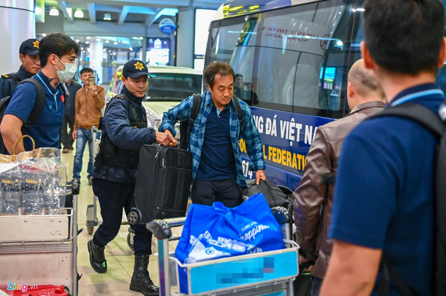 Chuyến bay chở ông Park Hang-seo và ban huấn luyện hạ cánh lúc 23h47 tại nhà ga T1 sân bay Nội Bài, trễ hơn 1 giờ đồng hồ so với dự kiến,