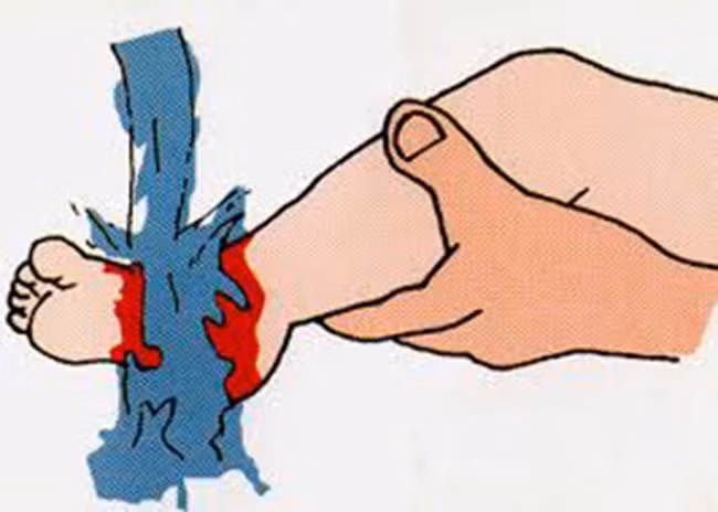 Nếu không có gì gắn ở vết thương, dùng miếng vải sạch ấn lên vết thương để kìm máu và quấn chặt xung quanh, tuy nhiên không quá chặt để máu vẫn chảy được đến ngón chân và tay. Tùy thuộc vào độ nghiêm trọng, hãy gọi cấp cứu.