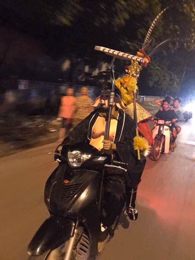Trong đó, Trư Bát Giới vừa cầm lái chiếc xe máy SH, vừa cầm chiếc bồ cào, trông khá nguy hiểm. Cả người này và "Tôn Ngộ Không" ngồi sau đều không đội mũ bảo hiểm.