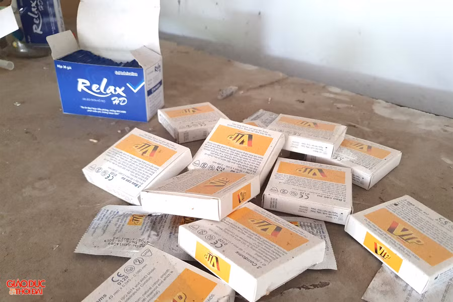 | Nhiều thùng vật tư y tế, bao cao su còn nguyên vẹn, chưa qua sử dụng bị vứt bỏ lại dưới gầm cầu thang. Ảnh: Phạm Tâm. |