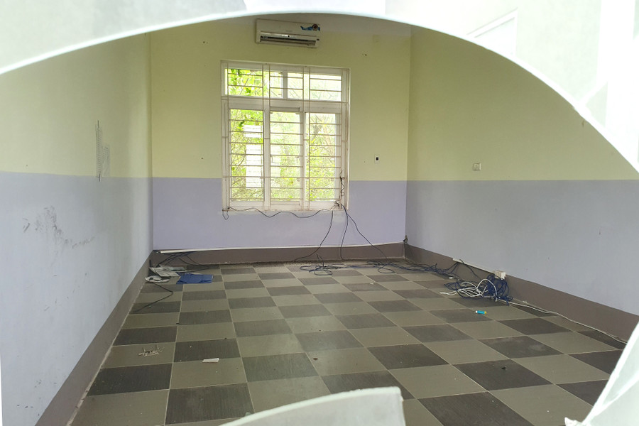 | Một số hạng mục đã bắt đầu có dấu hiệu xuống cấp; bên trong, phòng làm việc, nhiều đồ vật bị vứt bỏ ngổn ngang, trần nhà đã bị bong tróc loang lổ. Ảnh: Phạm Tâm. |