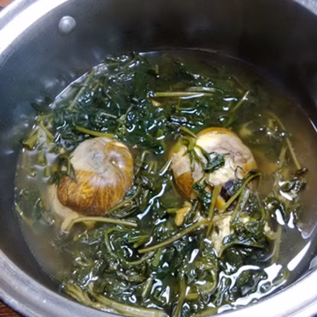 3, Đổ 1 bát nước lọc ngập rau đun đến khi sôi tì đập quả trứng cho vào. Tiếp tục đun sôi đến lần thứ 2 thì vặn nhỏ lửa, đun liu riu thêm lúc nữa để trứng chín thì tắt bếp.