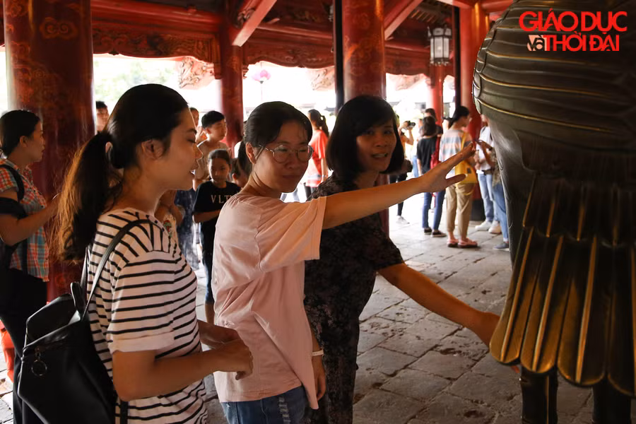 | Các sĩ tử được thoải mái sờ đầu rùa đồng cõng hạc đặt ở ngoài chính điện |
