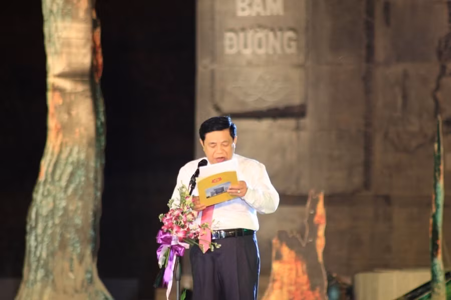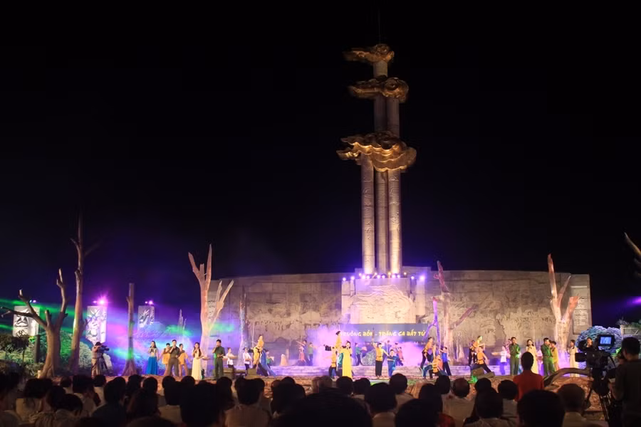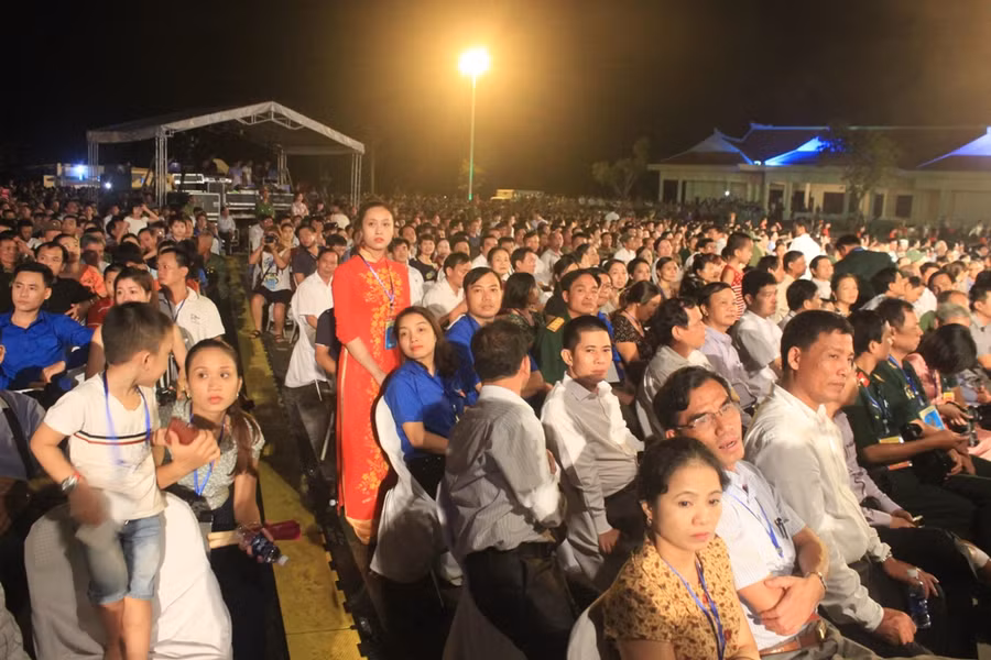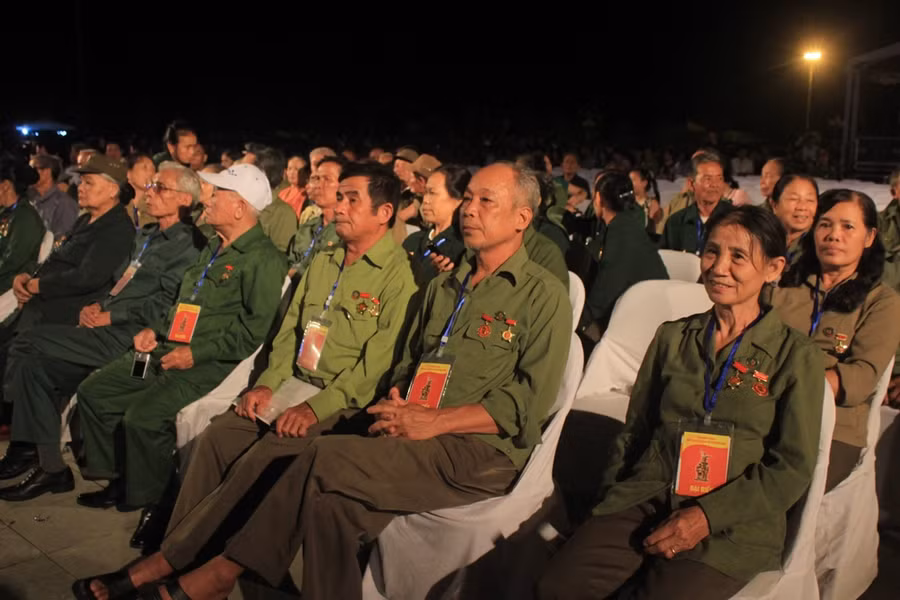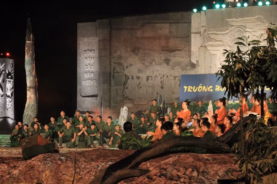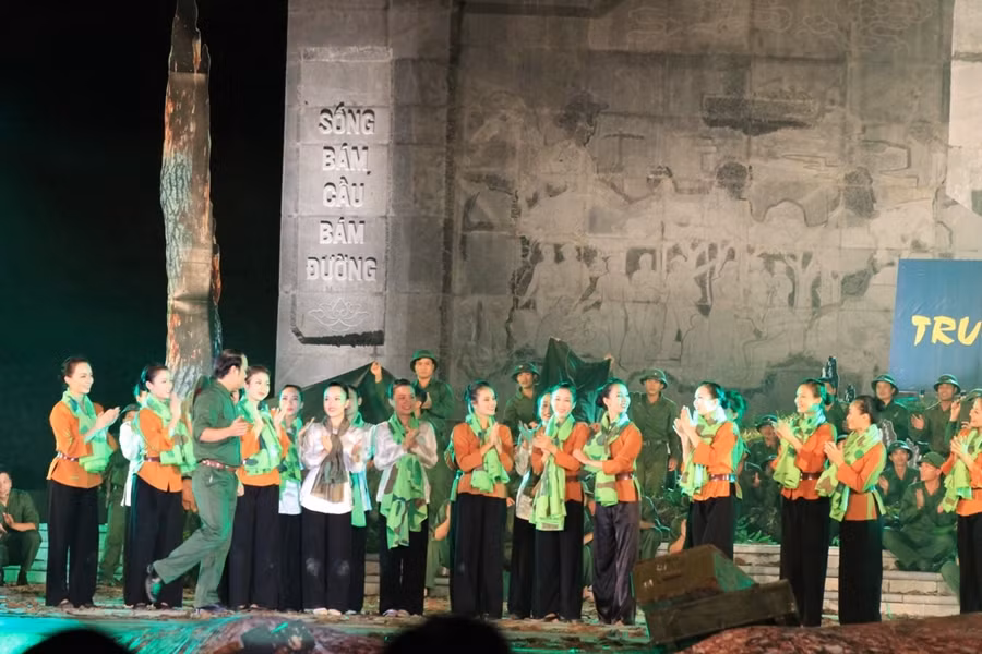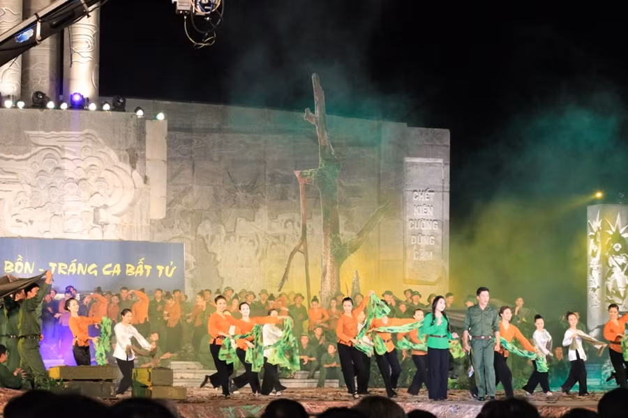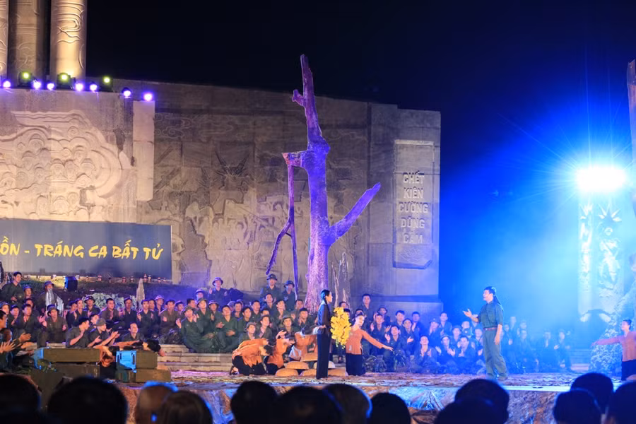Cả không gian bao la, rộng lớn được bao phủ bởi không khí trang nghiêm, thành kính. Chiến trường xưa dựng lại, rền vang đạn bom tàn phá.