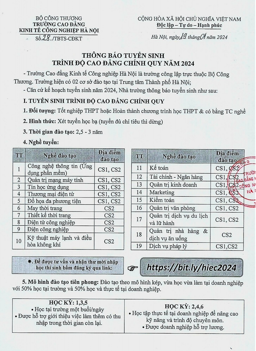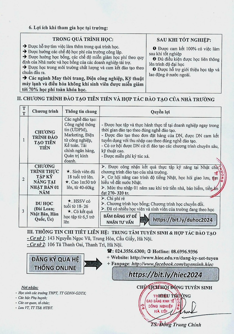 Phương thức tuyển sinh hệ Cao đẳng năm 2024 của HIEC là xét tuyển cho đến khi đạt đủ chỉ tiêu. Chi tiết như sau: