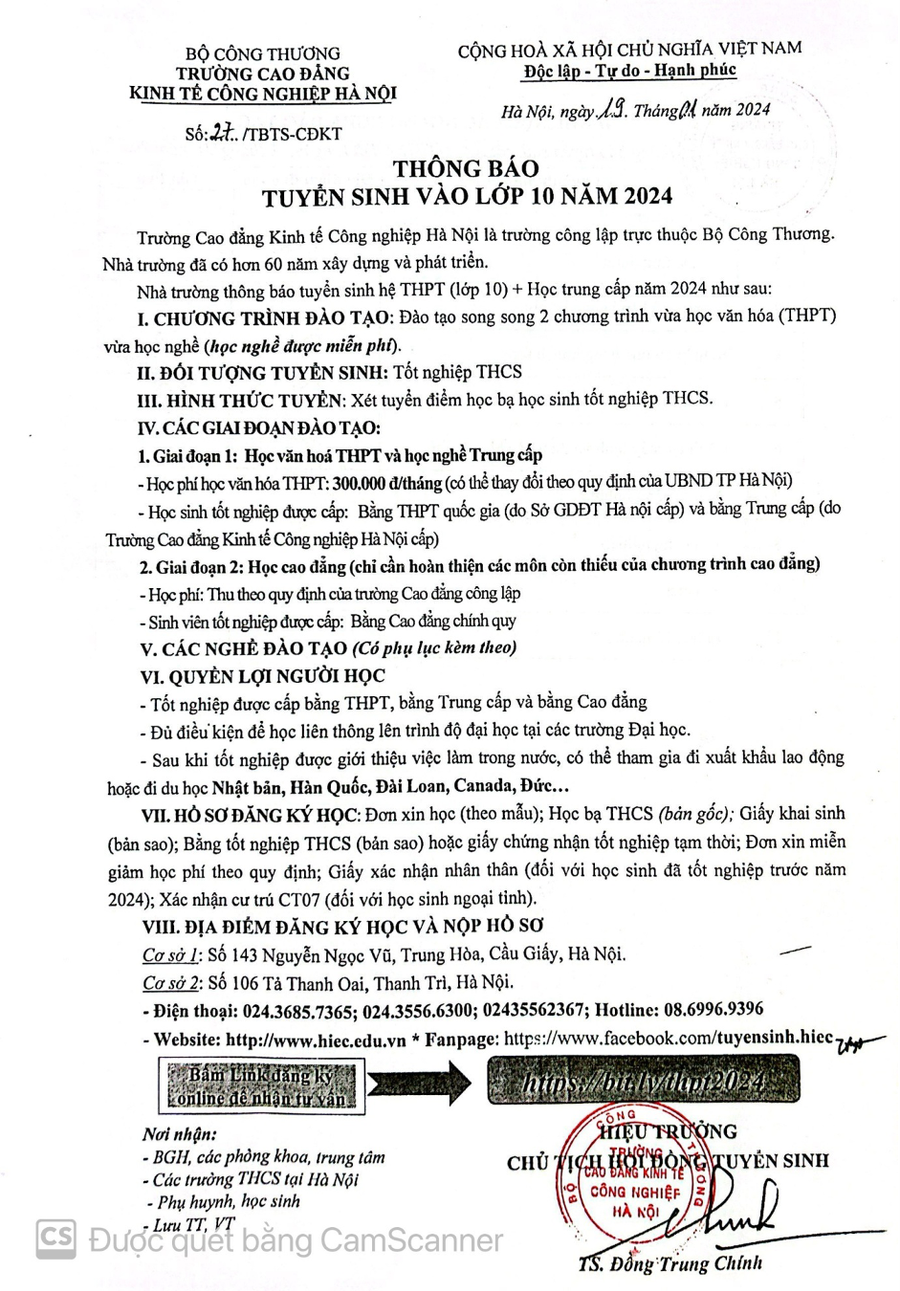 Phương thức tuyển sinh lớp 10 (THPT) + Học Trung cấp năm 2024: Xét tuyển theo kết quả xét tốt nghiệp THCS hoặc kết quả thi tốt nghiệp THPT (đủ điều kiện tốt nghiệp THCS hoặc THPT theo quy định của Bộ Giáo dục và Đào tạo)