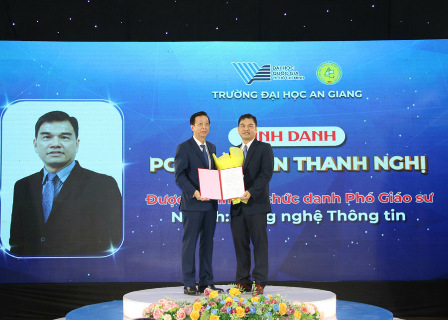 Tại buổi lễ, Nhà trường đã công bố quyết định số 294/QĐ-ĐHAG và quyết định số 295/QĐ-ĐHAG ngày 26/2/2024 bổ nhiệm chức danh Phó Giáo sư Trường Đại học An Giang cho TS Đoàn Thanh Nghị - Trưởng khoa Khoa Công nghệ thông tin, kiêm Giám đốc Trung tâm Tin học và TS Bùi Phan Thu Hằng – Giảng viên Bộ môn Chăn nuôi – Thú y, Khoa Nông nghiệp và Tài nguyên thiên nhiên.