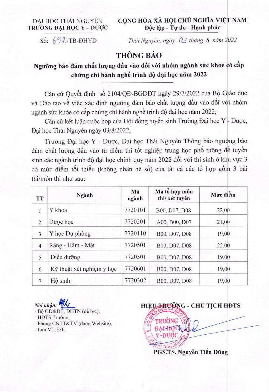 Hội đồng tuyển sinh Trường Đại học Y – Dược (ĐH Thái Nguyên) vừa công bố ngưỡng bảo đảm chất lượng đầu vào 7 chương trình đào tạo đại học chính quy năm 2022 theo phương thức xét kết quả kỳ thi tốt nghiệp THPT.