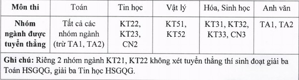 Thí sinh trong đội tuyển tham dự hội thi khoa học kỹ thuật quốc tế, thí sinh đoạt giải nhất, nhì, ba trong cuộc thi khoa học kỹ thuật cấp quốc gia, đã tốt nghiệp THPT, được xét tuyển thẳng vào ĐH theo nhóm ngành phù hợp với nội dung của đề tài do hội đồng tuyển sinh quyết định.