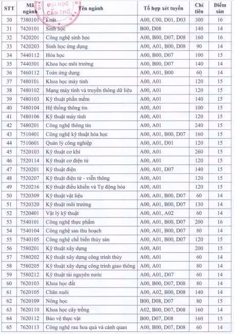 Sau đây là mức điểm sàn từng ngành của Trường ĐH Cần Thơ năm 2018: