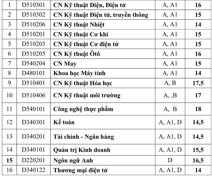 Khối ngành Công nghệ kỹ thuật (hệ Cử nhân công nghệ): Công nghệ cơ khí - cơ điện tử - ôtô: khối A 20,5 điểm, khối A1 20 điểm; Công nghệ TĐH - Điện tử - CNTT: khối A 21 điểm, khối A1 20 điểm; Công nghệ Hóa học - Thực phẩm: khối A 21 điểm