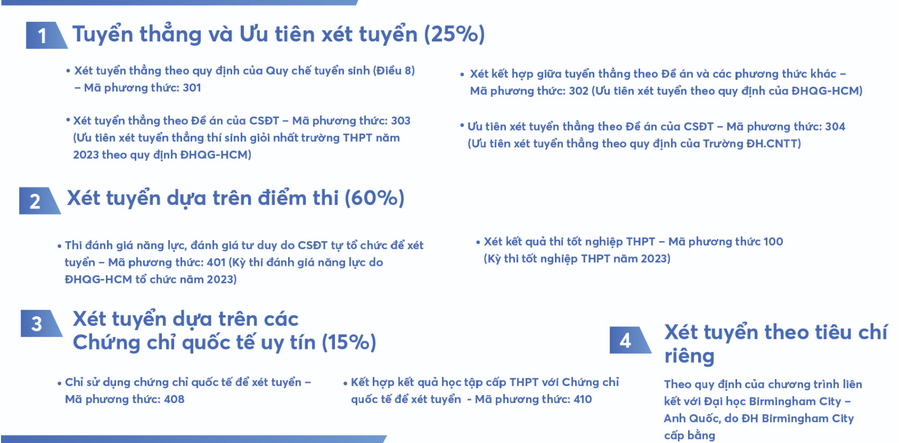 Trường sử dụng 4 phương thức tuyển sinh. Trong đó, phương thức xét tuyển dựa trên điểm thi, gồm thi đánh giá năng lực, xét kết quả thi tốt nghiệp THPT chiếm 60% tổng chỉ tiêu.