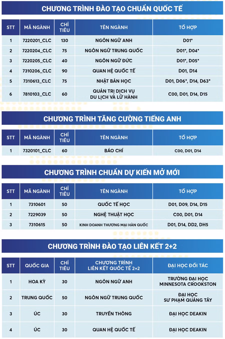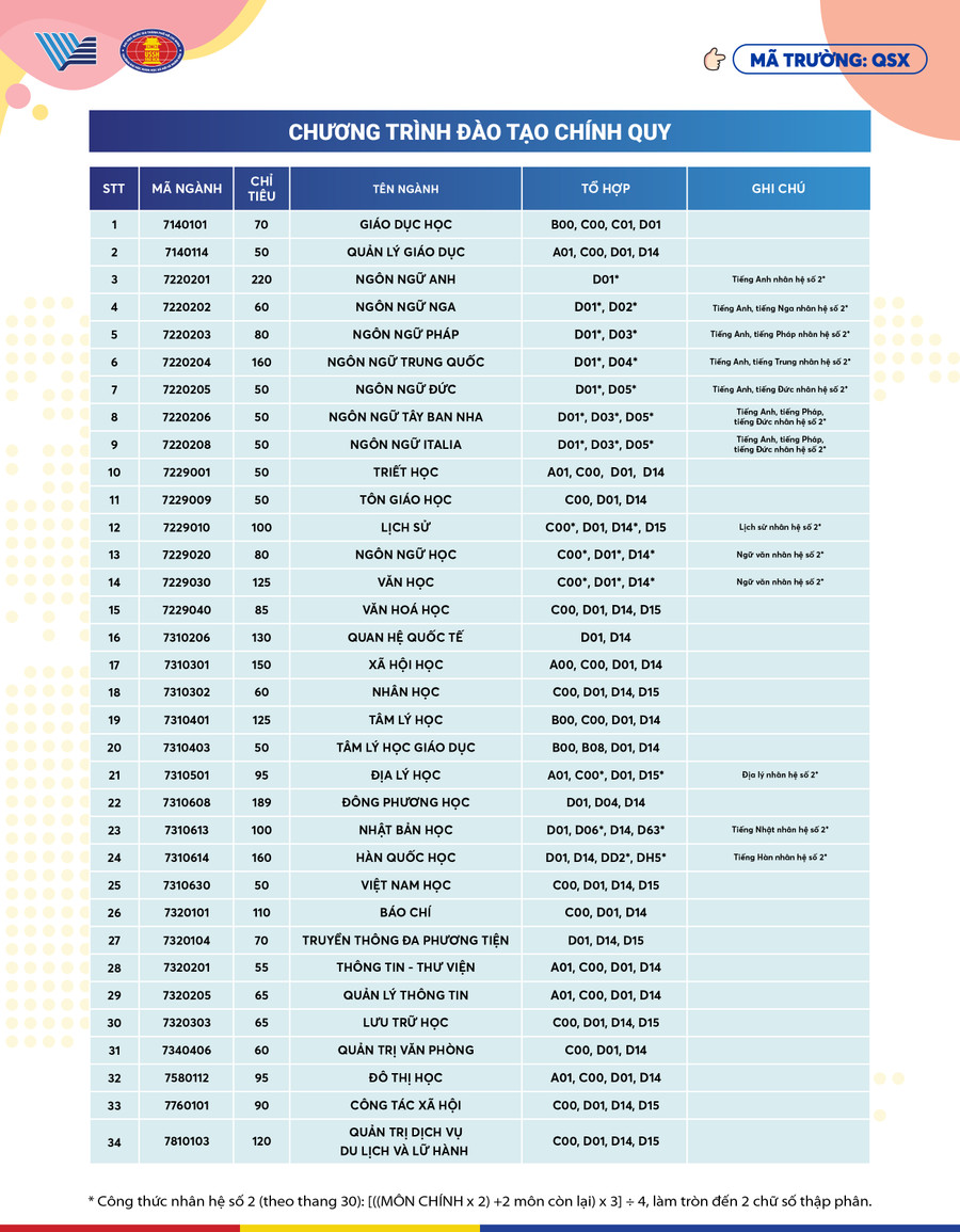 Nhà trường tuyển sinh 3.799 chỉ tiêu đối với 37 ngành đào tạo thuộc 3 chương trình chính quy gồm: chương trình chuẩn, chương trình chuẩn quốc tế và chương trình tăng cường tiếng Anh. So với năm ngoái, số lượng chỉ tiêu tăng 200.