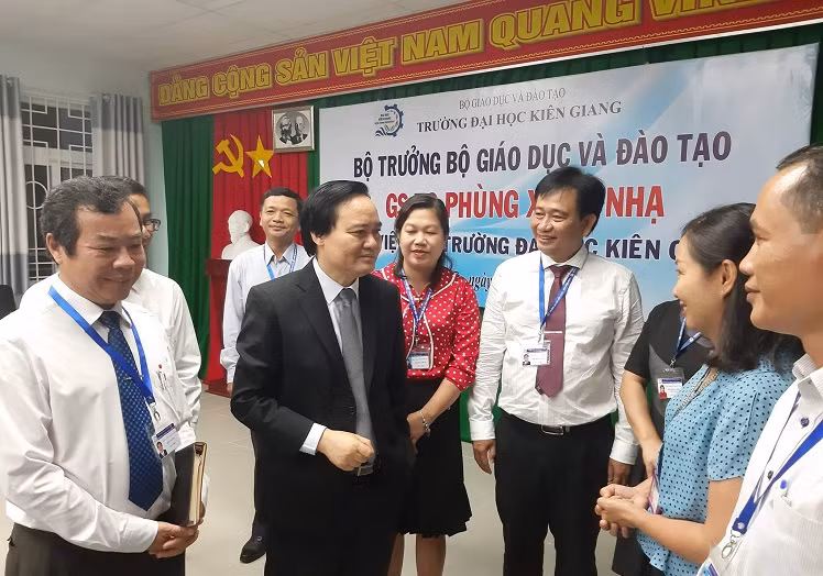 Làm việc với lãnh đạo, cán bộ, giảng viên Trường ĐH Kiên Giang, Bộ trưởng Bộ GD&ĐT Phùng Xuân Nhạ đánh giá cao sự tăng trưởng nhanh chóng của một trường đại học ở địa phương chỉ sau 5 năm thành lập.