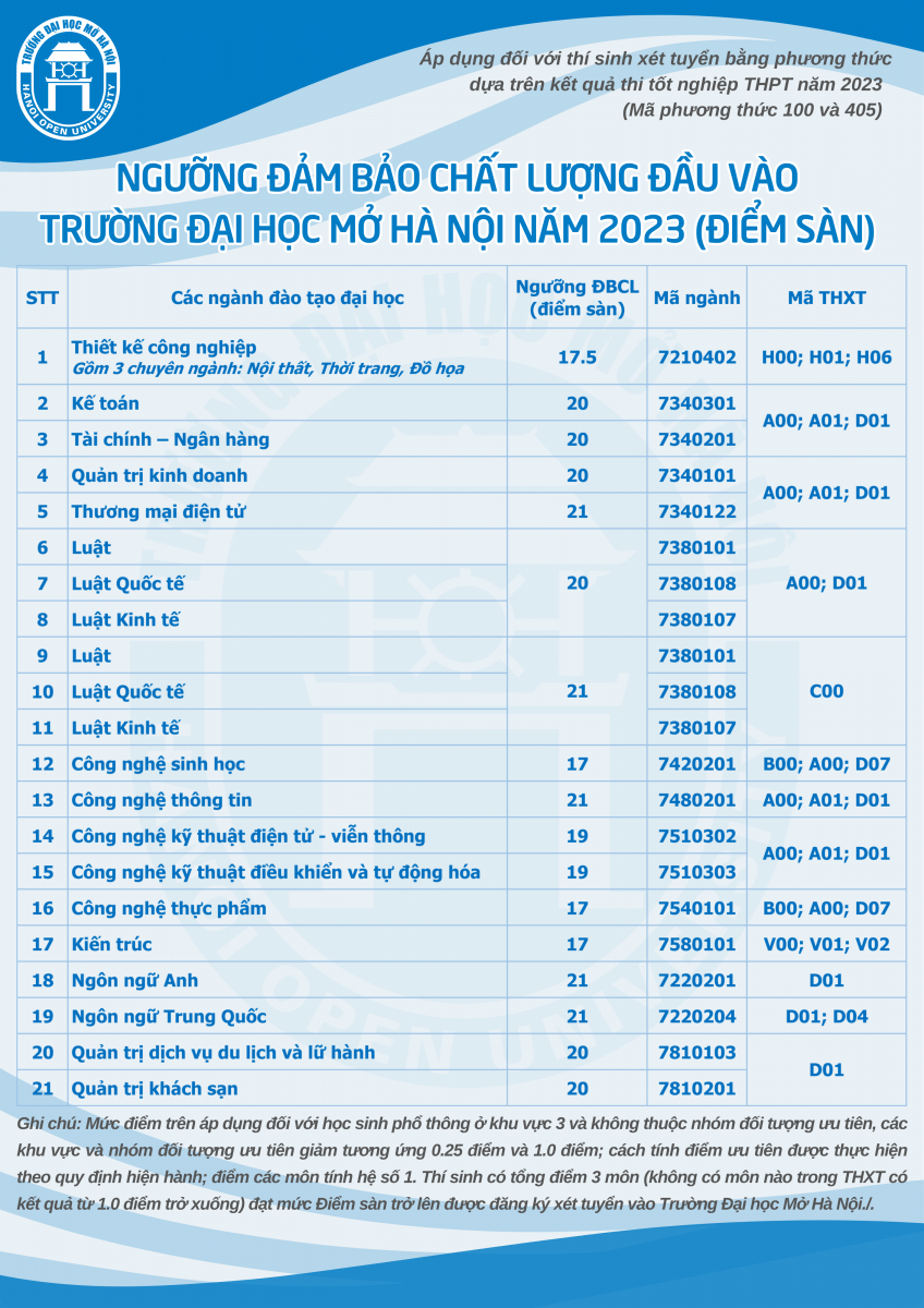 Hội đồng Tuyển sinh Trường ĐH Mở Hà Nội công bố ngưỡng đảm bảo chất lượng đầu vào đối với các ngành đào tạo trình độ đại học hệ chính quy. Theo đó, mức điểm sàn xét tuyển vào Trường ĐH Mở Hà Nội năm 2023 cơ bản đảm bảo ổn định so với các năm trước.