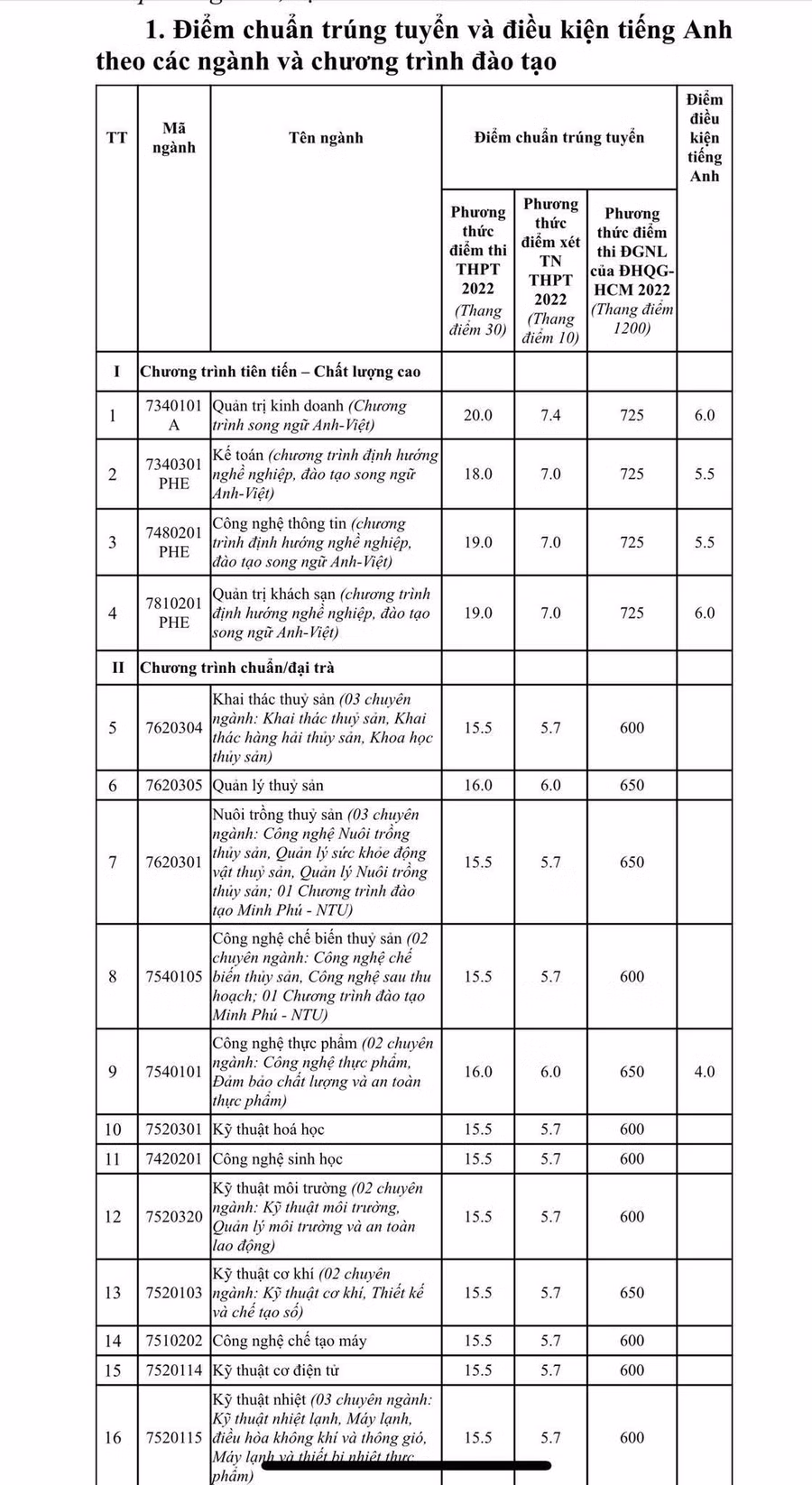 Điểm chuẩn trên áp dụng như nhau cho tất cả tổ hợp xét tuyển (phương thức điểm thi THPT) cho mỗi ngành, chương trình đào tạo. Trong đó, điểm điều kiện tiếng Anh là điểm thi môn tiếng Anh trong kỳ thi tốt nghiệp THPT năm 2022.