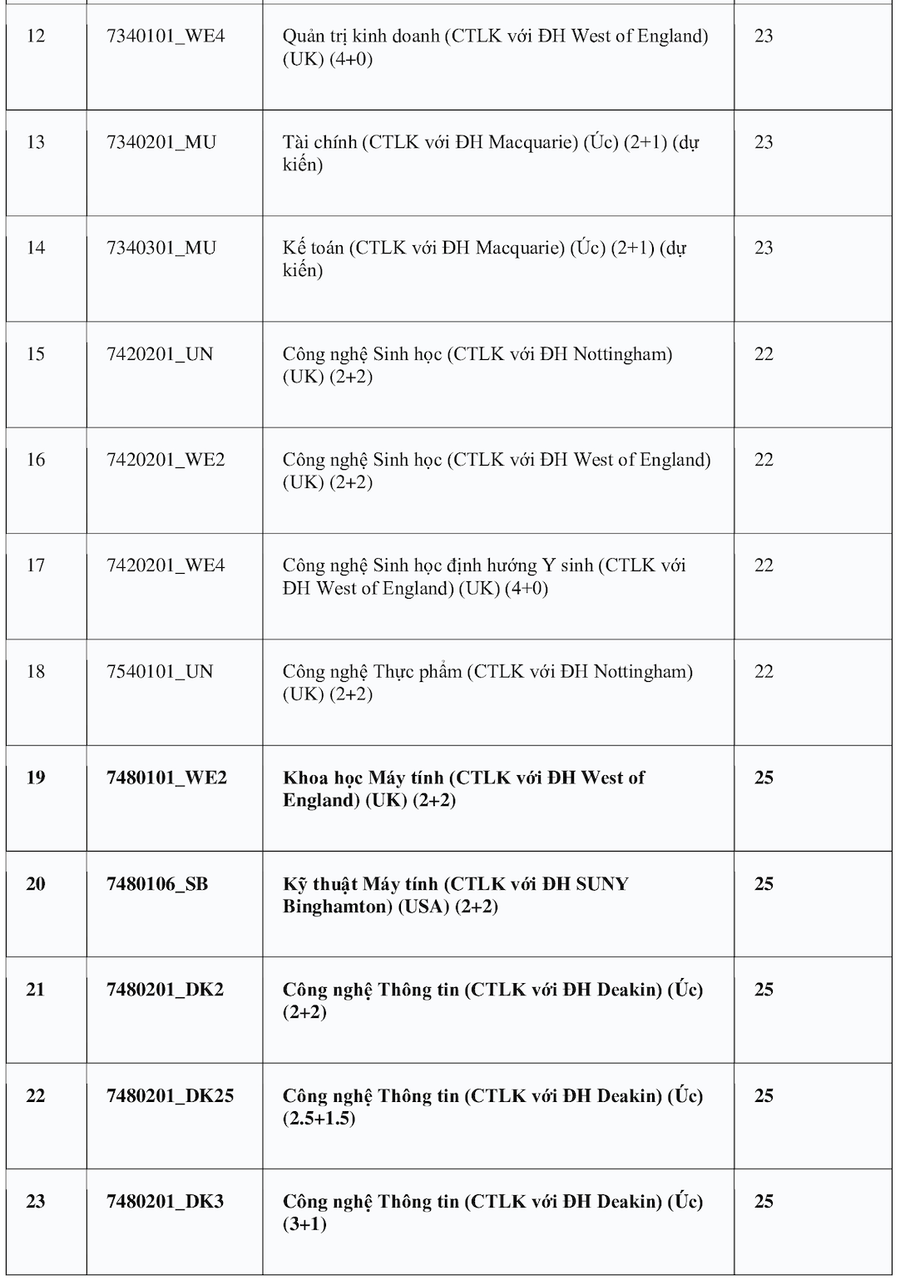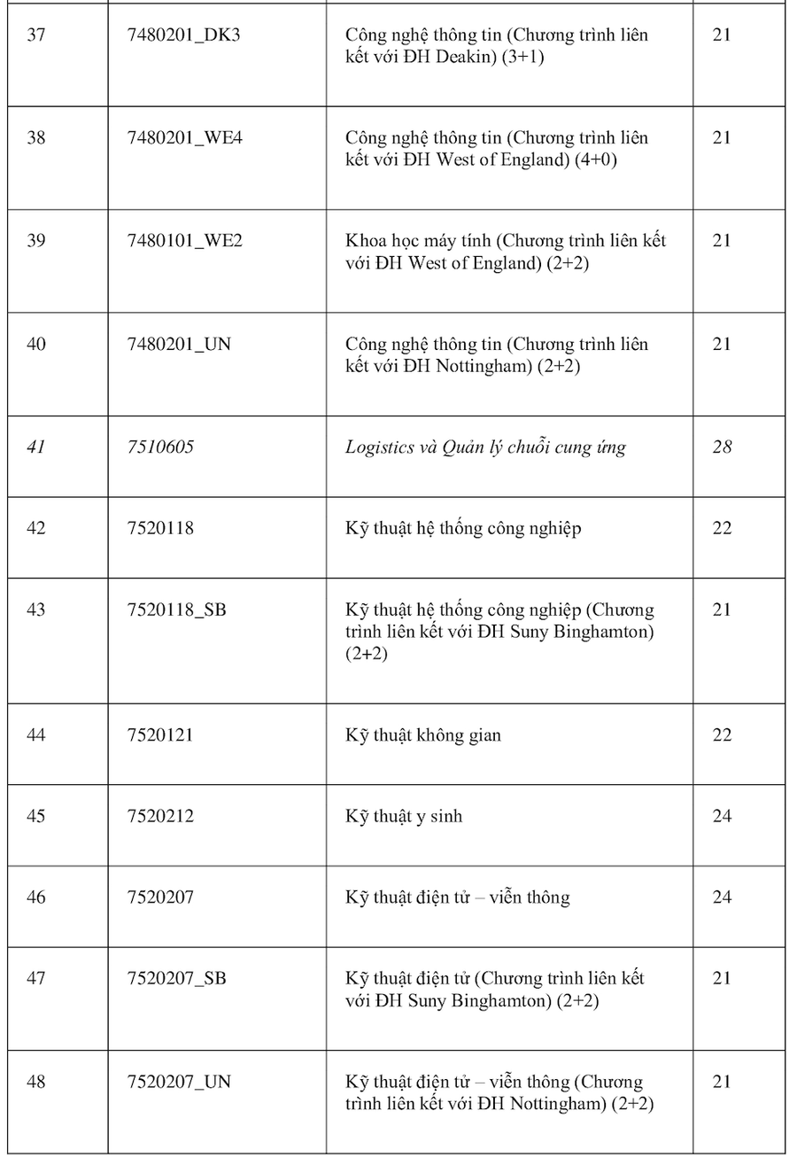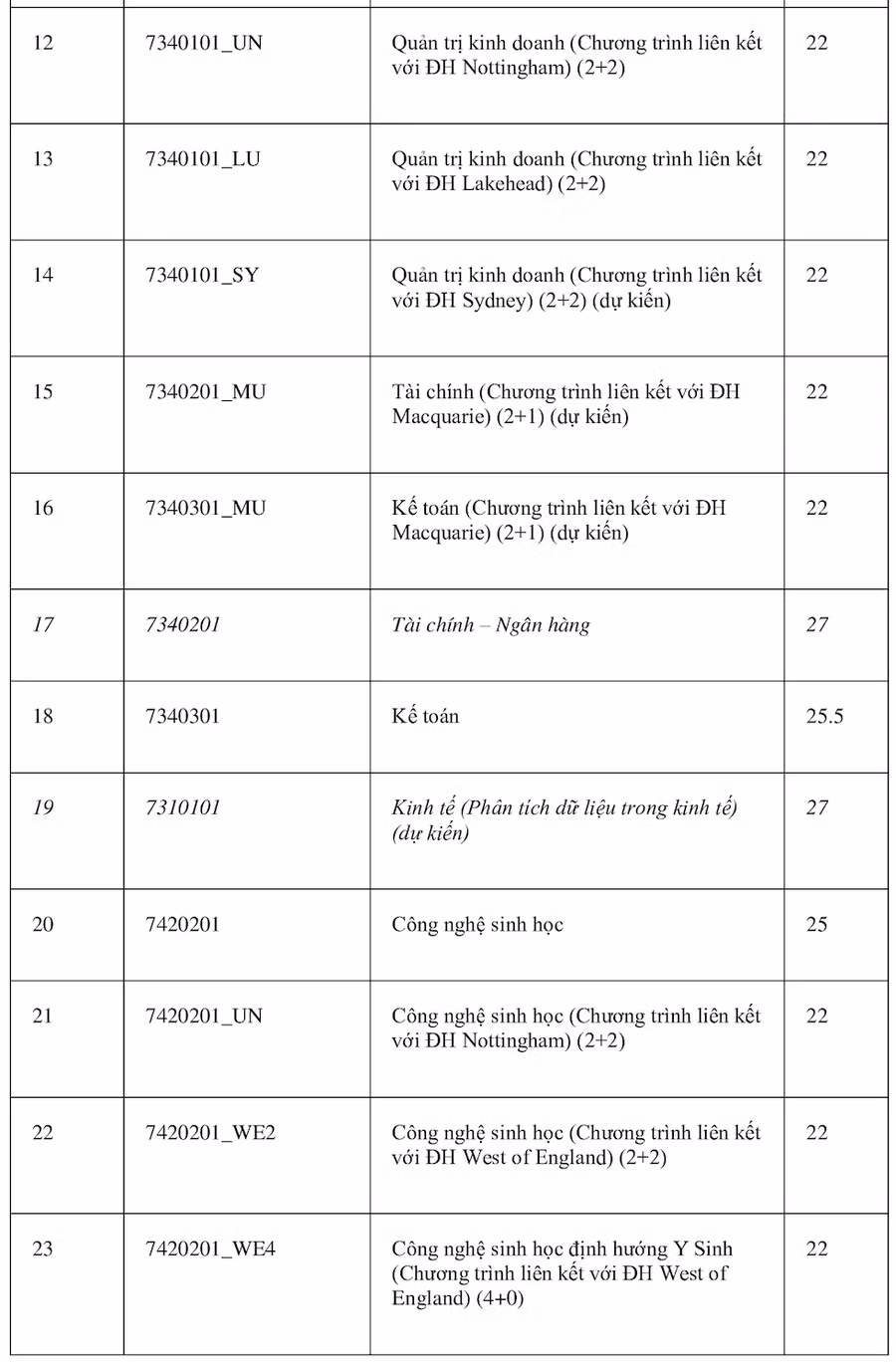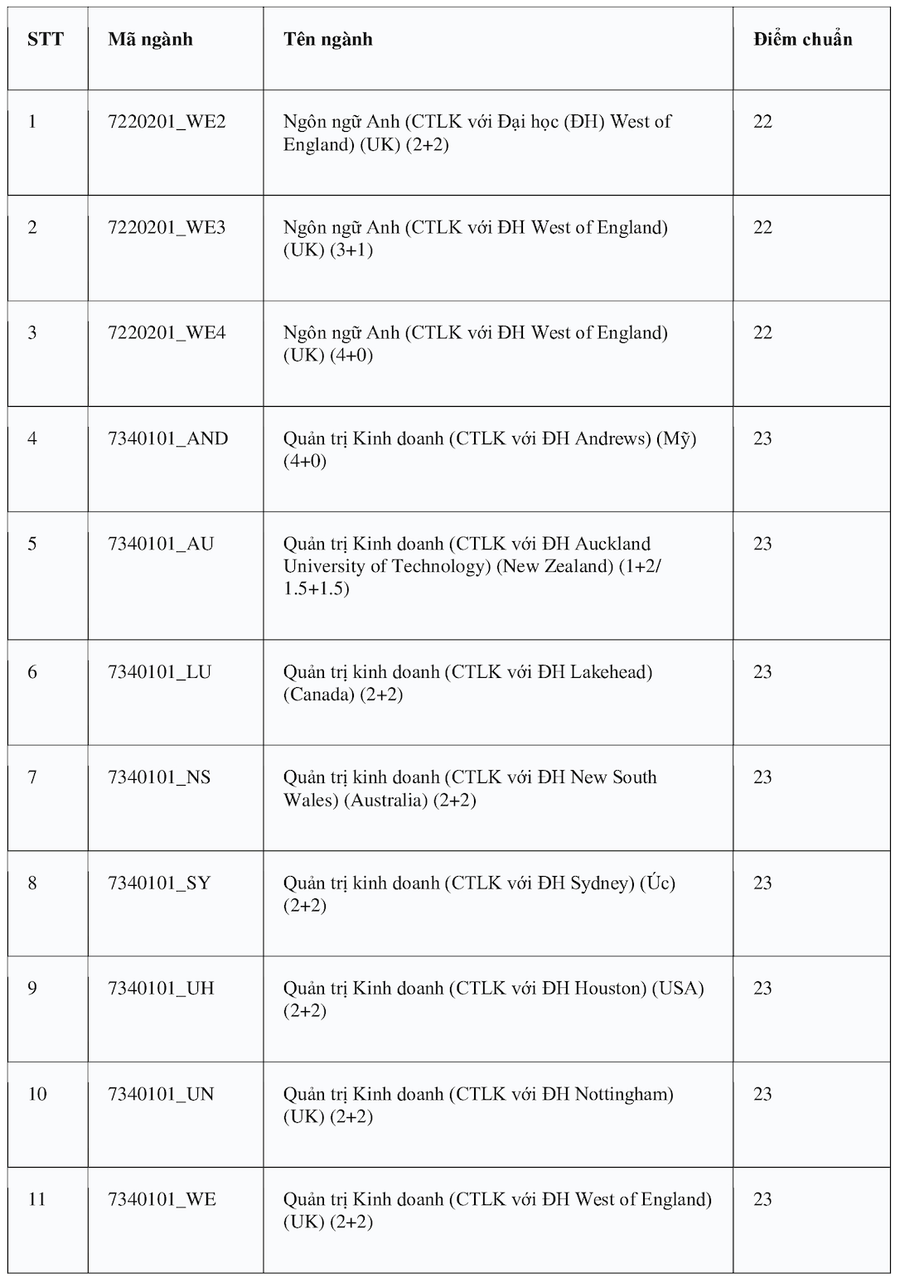 Theo đó, ngành Logistics và Quản lý chuỗi cung ứng và Ngôn ngữ Anh có điểm chuẩn cao nhất 28 điểm. Các nhóm ngành có điểm cao tiếp theo gồm: Quản trị Kinh doanh, Khoa học máy tính, Khoa học dữ liệu, Công nghệ thông tin (đều cùng 27,5 điểm); Tài chính Ngân hàng và Kinh tế (đều cùng 27 điểm). Các ngành còn lại đều ở mức điểm chuẩn từ 21 trở lên.