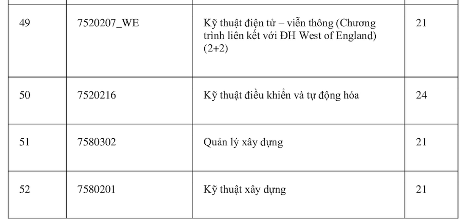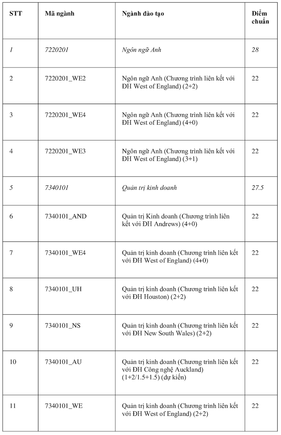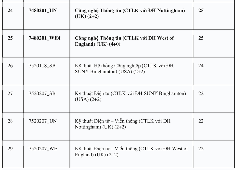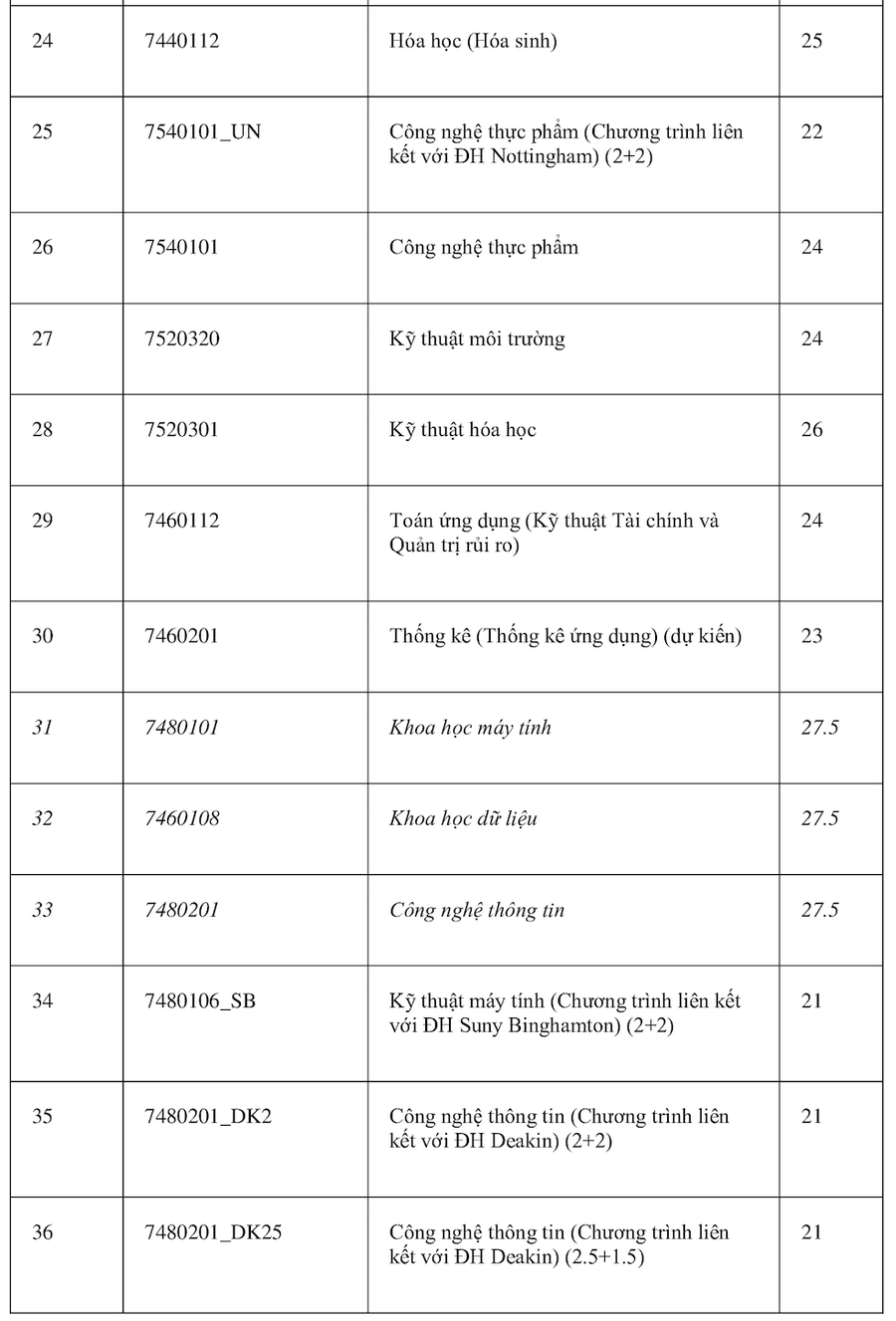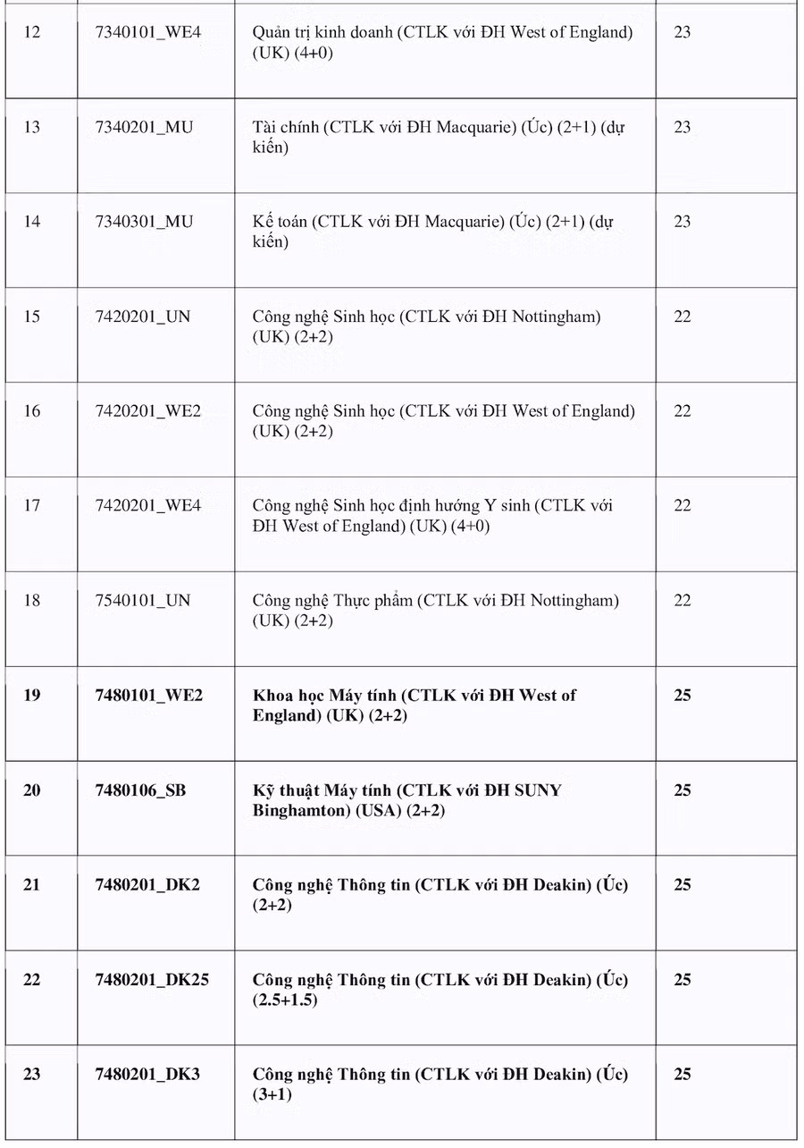 Theo đó, ngành Logistics và Quản lý chuỗi cung ứng và Ngôn ngữ Anh có điểm chuẩn cao nhất 28 điểm. Các nhóm ngành có điểm cao tiếp theo gồm: Quản trị Kinh doanh, Khoa học máy tính, Khoa học dữ liệu, Công nghệ thông tin (đều cùng 27,5 điểm); Tài chính Ngân hàng và Kinh tế (đều cùng 27 điểm). Các ngành còn lại đều ở mức điểm chuẩn từ 21 trở lên.