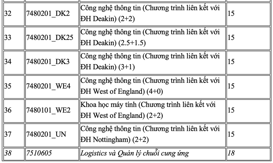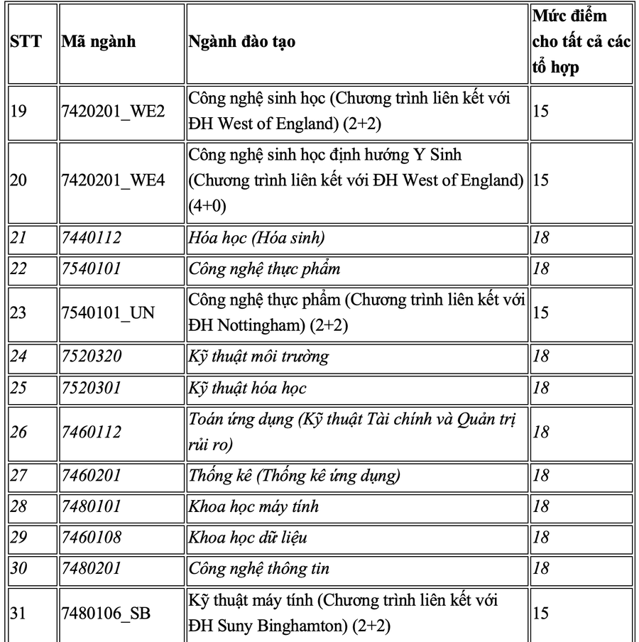 Theo đó, mức điểm sàn chung cho 23 ngành đào tạo đại học do trường cấp bằng sẽ là 18 điểm; các nhóm ngành thuộc chương trình liên kết đào tạo cùng đối tác là 15. Cụ thể như sau: