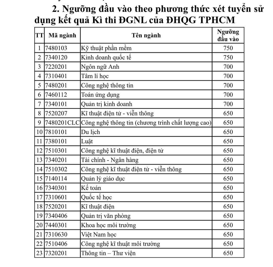 Theo đó, ngưỡng điểm xét tuyển theo phương thức điểm thi Kỳ thi Đánh giá năng lực (ĐGNL) của ĐHQG TP.HCM vào trường là từ 650-750 điểm (theo thang điểm 1.200)