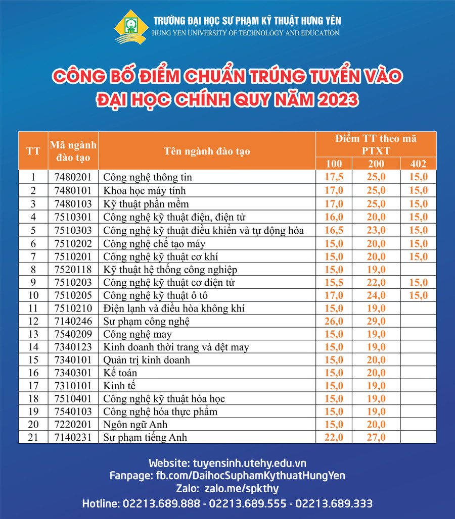 Ngày 22/8/2023, Trường Đại học Sư phạm Kỹ thuật Hưng Yên công bố điểm trúng tuyển Đại học hệ Chính quy năm 2023. Theo đó, các ngành có điểm trúng tuyển cao nhất thuộc lĩnh vực Sư phạm, Công nghệ Thông tin, Công nghệ Kỹ thuật ô tô, Công nghệ kỹ thuật điều khiển và tự động hóa