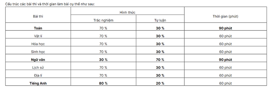 Nội dung các bài thi tương ứng và phù hợp với nội dung các môn học, môn thi cấp THPT mà học sinh đã quen thuộc; thí sinh làm bài thi trực tiếp trên giấy.