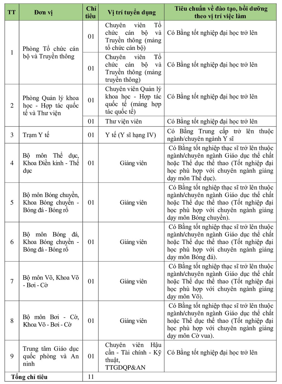 2. Địa điểm tiếp nhận hồ sơ: Hồ sơ nộp trực tiếp trong giờ hành chính tại phòng Tổ chức cán bộ và Truyền thông, phòng 403 tầng 4 nhà Điều hành, Trường Đại học Sư phạm Thể dục Thể thao Hà Nội, xã Chương Mỹ, huyện Phụng Châu, thành phố Hà Nội.