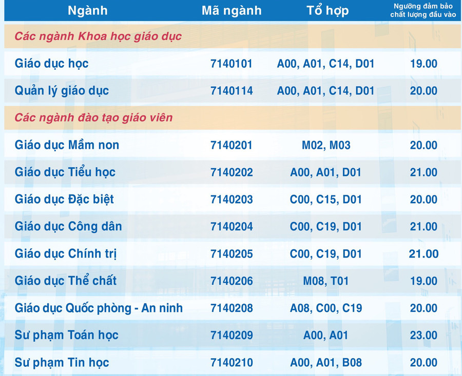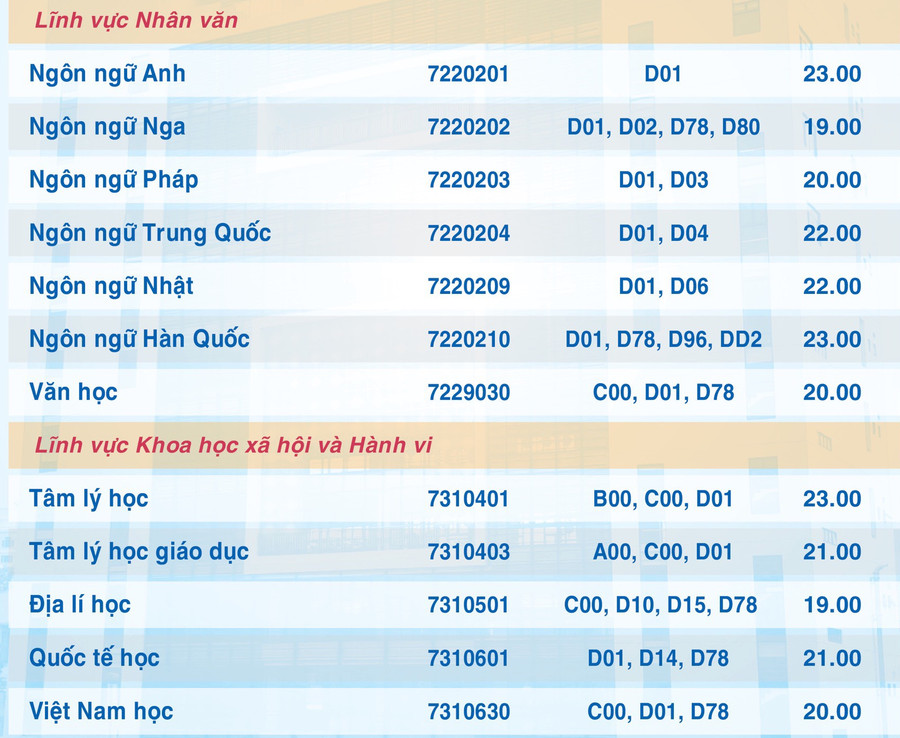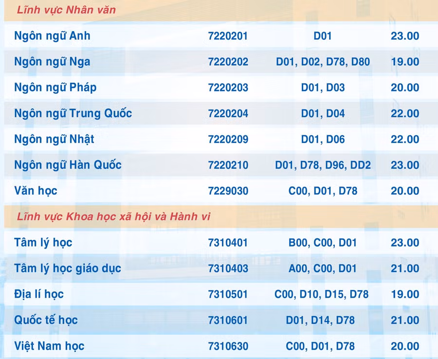 Theo đó, điểm sàn nhiều ngành ở mức 23 điểm gồm: Sư phạm Toán học, Sư phạm Vật lý, Sư phạm Hoá học, Sư phạm Ngữ văn, Sư phạm Tiếng Anh, Ngôn ngữ Anh, Ngôn ngữ Hàn Quốc, Tâm lý học.