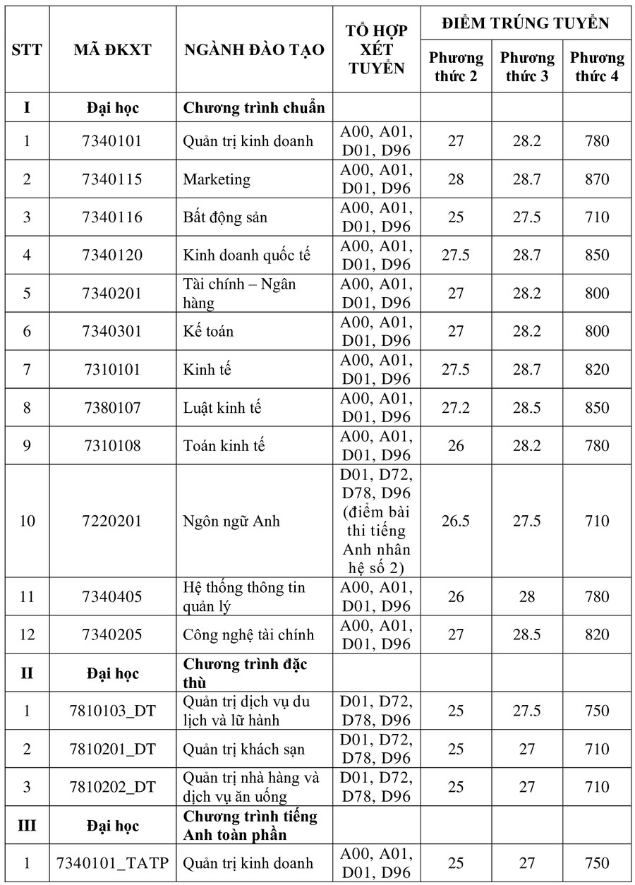 Ở phương thức 2, điểm trúng tuyển áp dụng chung cho các tổ hợp xét tuyển của ngành và chương trình đào tạo, bao gồm các mức điểm ưu tiên áp dụng cho thí sinh hưởng chính sách ưu tiên trong tuyển sinh (gồm đối tượng ưu tiên, khu vực ưu tiên) theo quy định hiện hành.