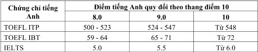 Đối với thí sinh có chứng chỉ quốc tế về tiếng Anh (IELTS, TOEFL) đang trong thời hạn tính đến ngày 20/7/2018: Điểm tiếng Anh dùng để xét tuyển là điểm bài thi tiếng Anh trong kỳ thi THPT quốc gia năm 2018 hoặc điểm tiếng Anh quy đổi theo thang điểm 10 tương đương với từng loại/mức điểm của từng chứng chỉ tiếng Anh; thí sinh được sử dụng điểm cao hơn để xét tuyển. Điểm tiếng Anh quy đổi được tính như sau: