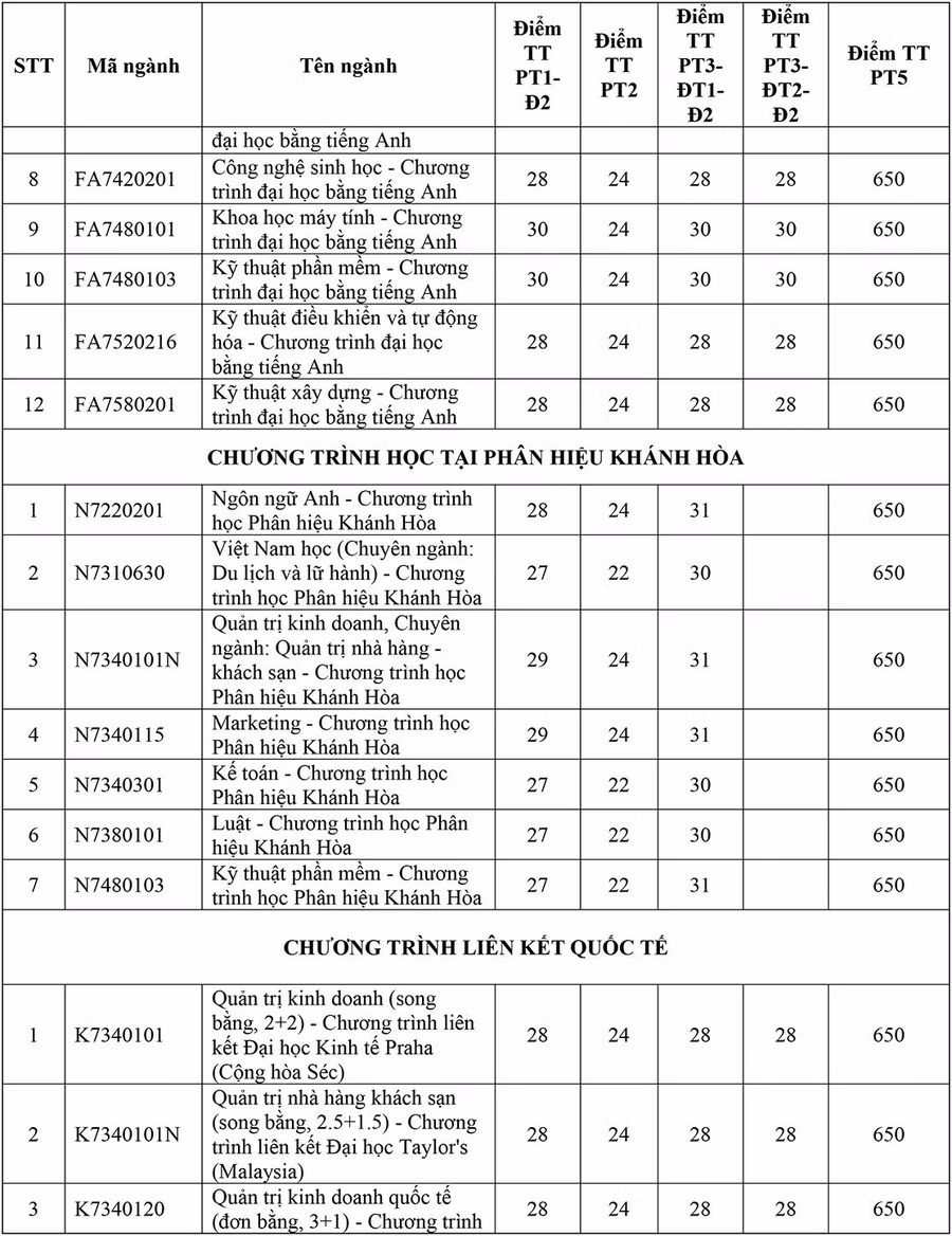 Phương thức xét tuyển theo điểm thi đánh giá năng lực của Đại học Quốc gia TPHCM năm 2022 (PT5): Điểm xét tuyển được thực hiện theo đúng đề án tuyển sinh đại học năm 2022 theo thang điểm 1200 (đã bao gồm điểm ưu tiên khu vực, đối tượng theo thang điểm 1200)