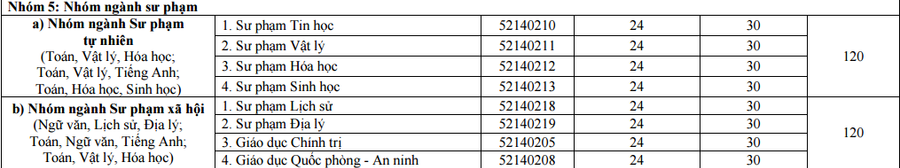 Cụ thể, nhóm ngành xét tuyển thêm gồm sư phạm tự nhiên (Tin học, Vật lý, Hóa học, Sinh học); nhóm ngành sư phạm xã hội (Lịch sử, Địa lý, Giáo dục chính trị, Giáo dục quốc phòng - an ninh), mỗi môn 30 chỉ tiêu. Ngưỡng xét tuyển là 24 điểm.
