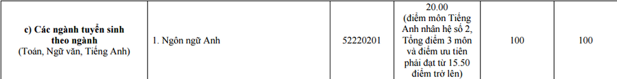 Với ngành Ngôn ngữ Anh, trường xét thêm 100 chỉ tiêu; ngưỡng xét tuyển là 20 điểm (tổng điểm môn Tiếng Anh nhân hệ số 2; tổng điểm 3 môn và điểm ưu tiên phải đạt từ 15,5 điểm trở lên).
