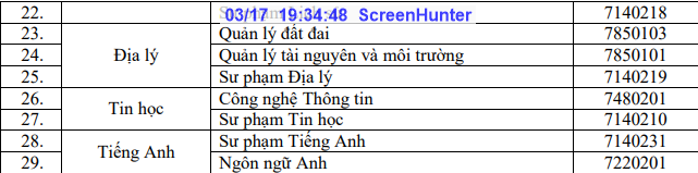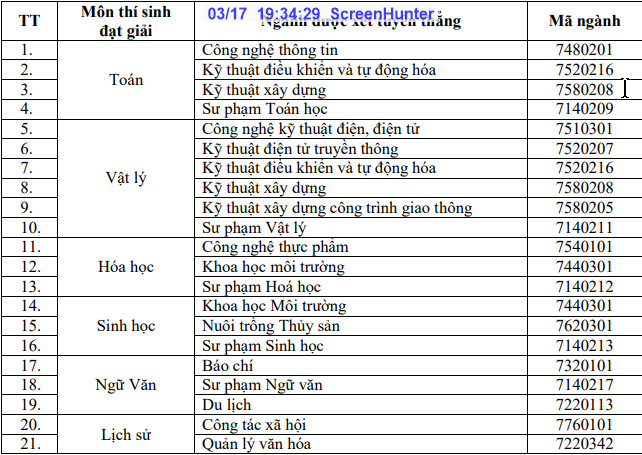 Danh mục ngành đăng ký tuyển thẳng đối với thí sinh đạt giải nhất, nhì, ba trong Kỳ thi chọn học sinh giỏi quốc gia THPT bao gồm: