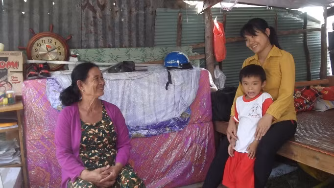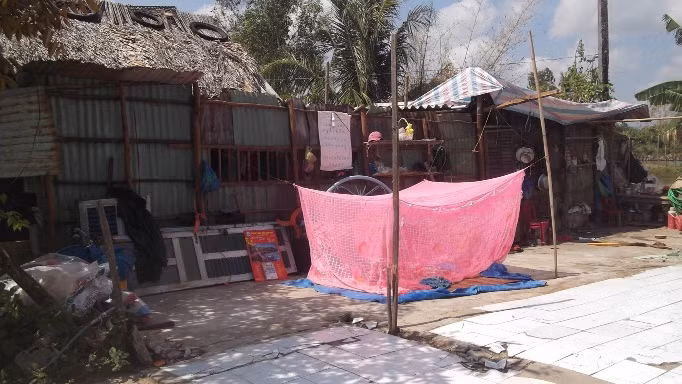 Còn nhà cô Huế bị lốc xoáy cuốn tấm lợp bay đi gần hết, số còn lại cũng hư hỏng, hiện gia đình cô che tạm mái che ở nhờ phần đất của hàng xóm.