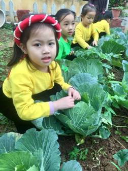 Các bé được tự tay chăm sóc rau trong vườn rau nhà trường