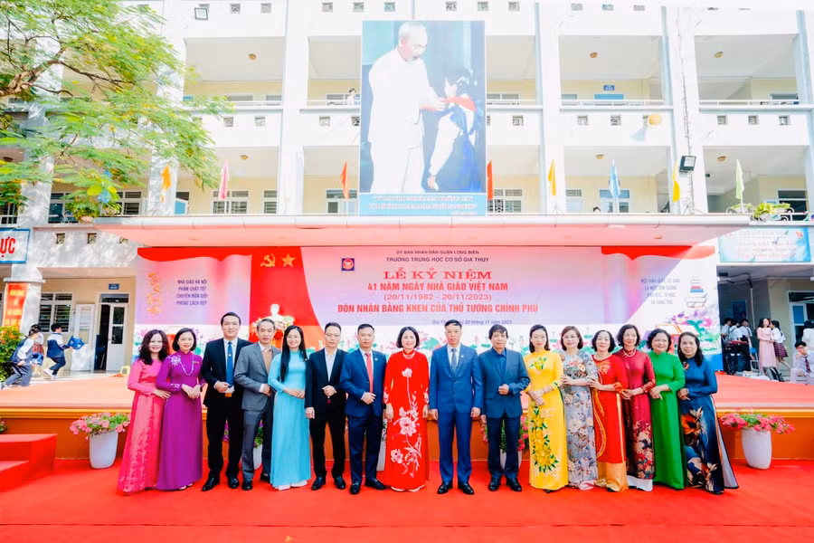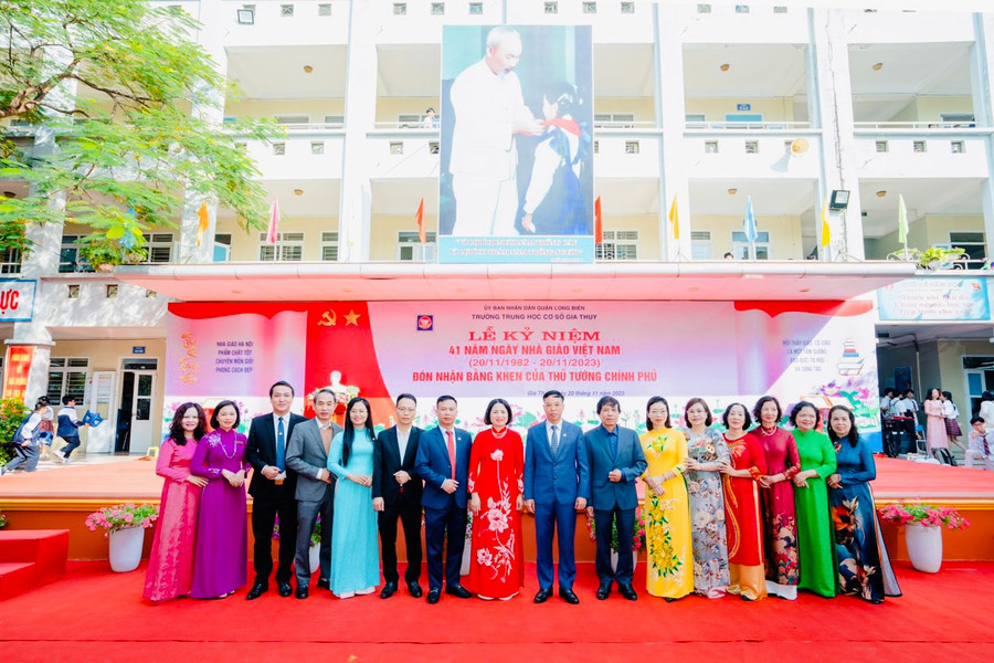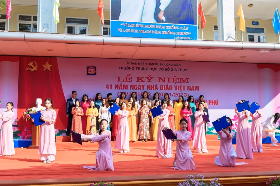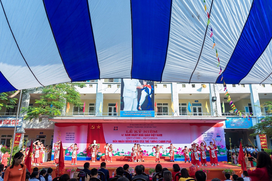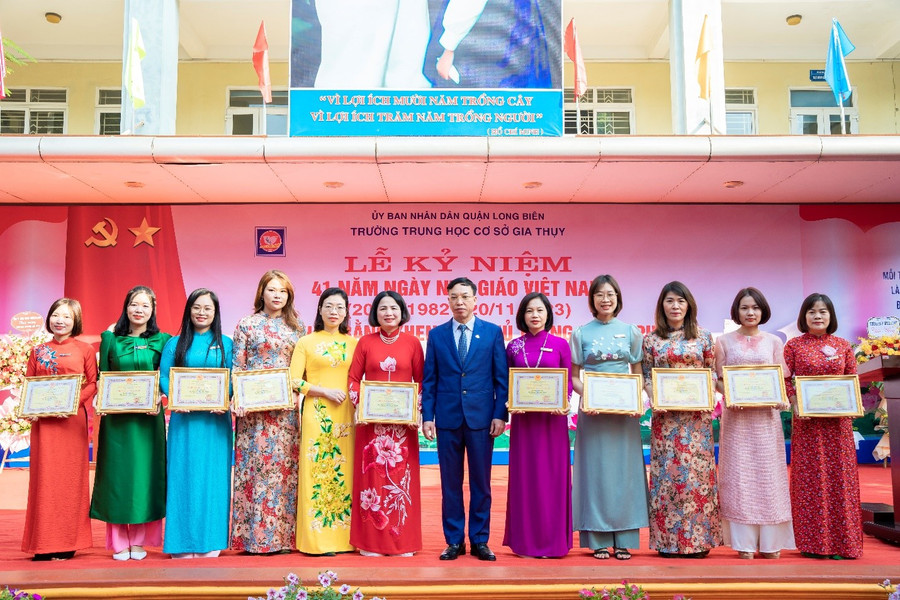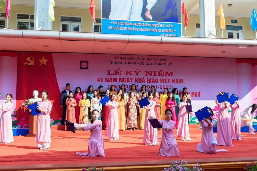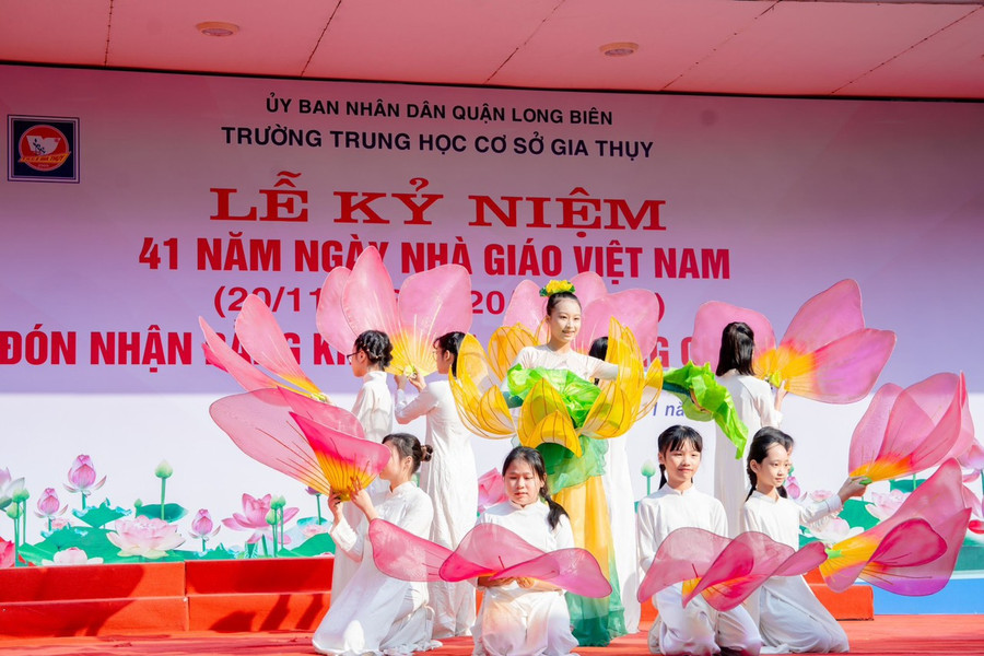 Phát biểu tại buổi lễ, bà Nguyễn Thị Mỹ Linh, Hiệu trưởng Trường THCS Gia Thuỵ chia sẻ, dân tộc Việt Nam có truyền thống "tôn sư trọng đạo", người thầy luôn là tấm gương sáng về đạo đức, tự học và sáng tạo, sẵn sàng cống hiến, đam mê với công việc. Nối tiếp truyền thống tốt đẹp của các thế hệ nhà giáo đi trước, các thầy giáo, cô giáo Trường THCS Gia Thụy luôn cố gắng, không ngừng đổi mới, tâm huyết với nghề; luôn truyền lửa, lan tỏa niềm đam mê học tập cho các thế hệ học trò.