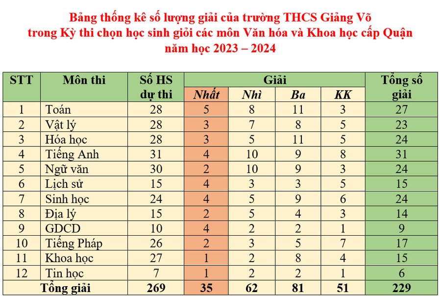 Đại diện lãnh đạo trường THCS Giảng Võ cho biết, so với năm học 2022 - 2023, ở năm học này, đội tuyển thi HSG cấp quận Ba Đình của nhà trường đã đạt được kết quả cao hơn cả về số lượng và chất lượng giải (tăng 29 giải trong tổng số giải, tăng 17 giải Nhất).