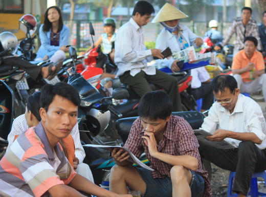 | Các phụ huynh ngồi chờ con em mình trước điểm thi Đại học KHXH&NV. Ảnh, gdtd.vn |