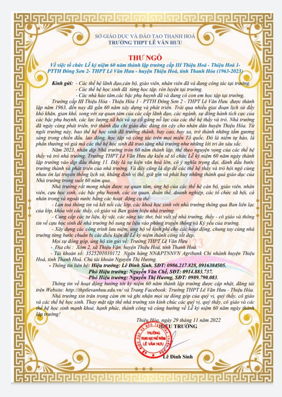 Được thành lập từ năm 1963, đến nay tròn 60 năm Trường THPT Lê Văn Hưu hoàn thành xuất sắc nhiệm vụ nâng bước tri thức cho học sinh huyện Thiệu Hóa, tỉnh Thanh Hóa.