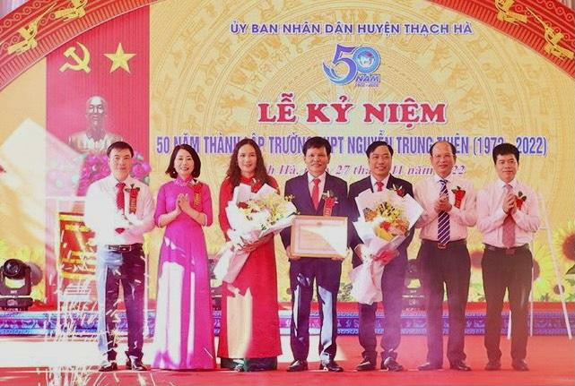 | Lãnh đạo tỉnh Hà Tĩnh tặng hoa chúc mừng 50 thành lập trường THPT Nguyễn Trung Thiên. |